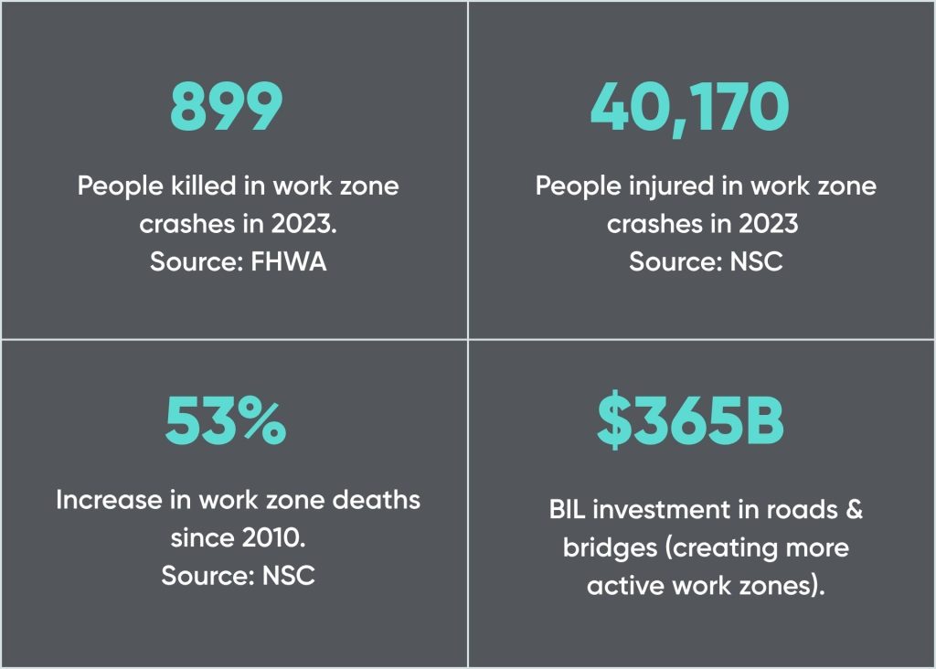 The Bipartisan Infrastructure Law (BIL) authorized $350 billion in highway investment, creating a wave of new construction that will expand the number of active work zones across every state in the country over the next decade. More work zones mean more workers at risk and more urgency to deploy systems that protect them.